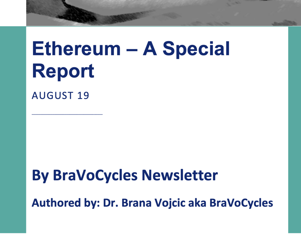 This Ethereum Special Report by Dr. Brana Vojcic of BraVoCycles is an 8-page PDF offering technical analysis of Ethereum's market trends and price projections. It includes a cycle composite analysis of ETHBTC, a dynamic cycle composite of ETHUSD with cyclic-RSI indicators, and Hurst cycle analysis. The report also features four Elliott Wave scenarios on both linear and logarithmic scales, examining potential long-term price paths for Ethereum.