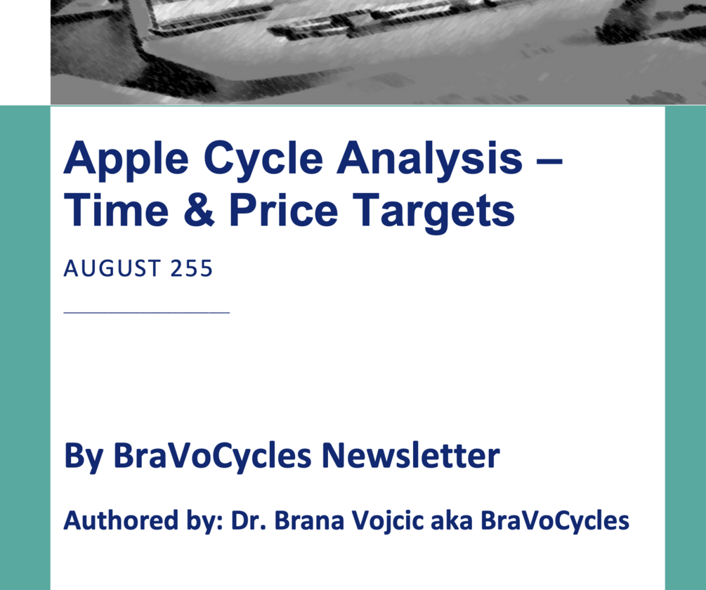 The Apple Cycle Analysis Report by Dr. Brana Vojcic of BraVoCycles is a 10-page PDF report providing technical analysis of Apple's stock price trends with a focus on time and price targets through dynamic cycle analyses of daily and weekly charts featuring cycle composites and detailed explanations of cycle price projections. It also includes an introduction to recent Apple developments such as AI enhancements, investments, manufacturing initiatives, and leaked hardware roadmaps.